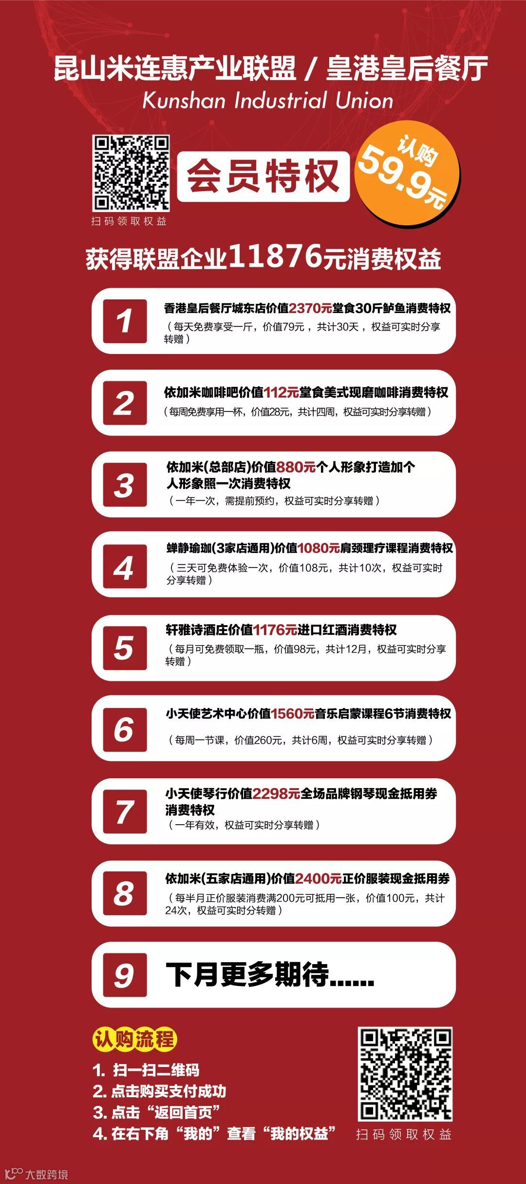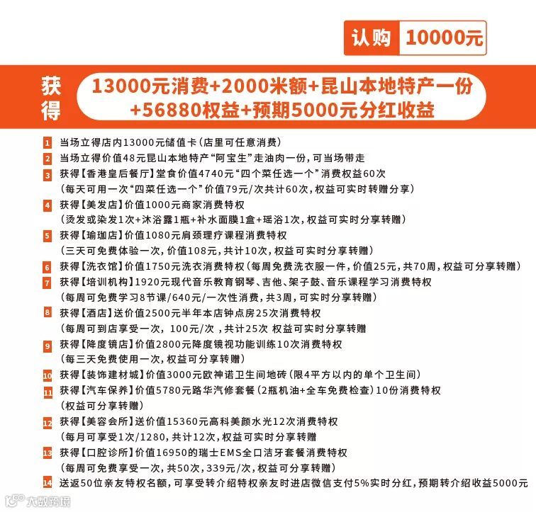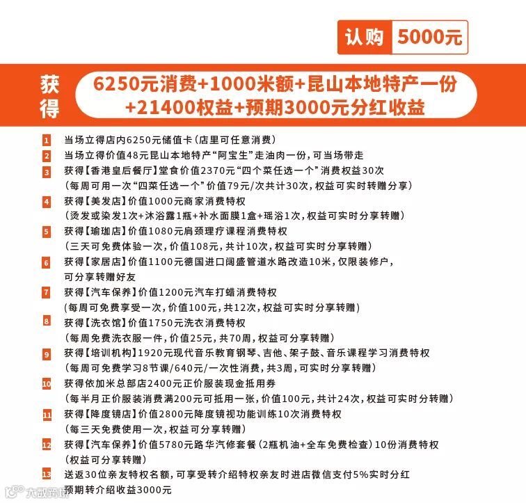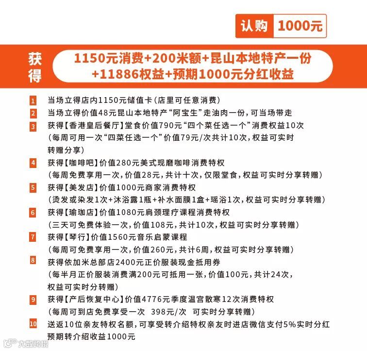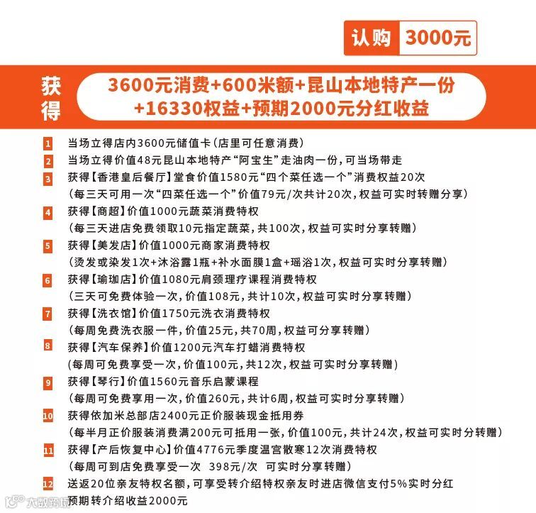 具体是这样的,客户在店里认购59.9元,能享受香港皇后餐厅价值2370元堂食30斤鲈鱼消费特权;依加米咖啡吧价值112元堂食美式现磨咖啡消费特权;蝉静瑜伽 (3家店通用)价值1080元肩颈理疗课程消费特权;轩雅诗酒庄价值1176元进口红酒消费特权;依加米(总部店)价值880元个人形象打造加个人形象照一次消费特权;依加米(5家店通用)价值2400元正价服装现金抵用券;小天使艺术中心价值1560元音乐启蒙课程6节消费特权;小天使琴行提供2298元全场品牌钢琴现金抵用券消费特权。