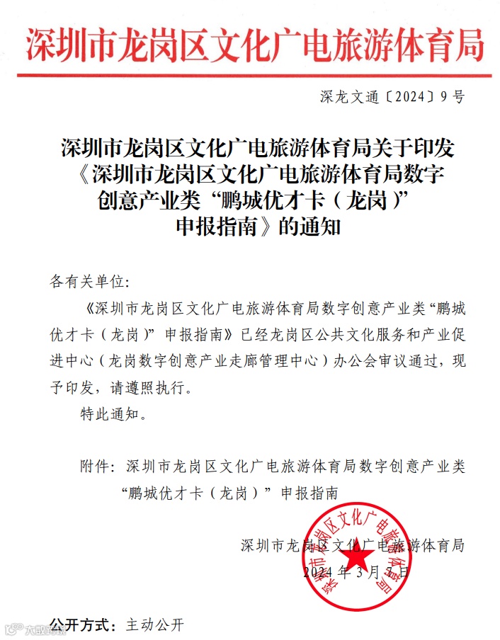 深圳市龙岗区文化广电旅游体育局数字创意 产业类“鹏城优才卡(龙岗)”申报指南 为优化全区人才发展环境,做好高精尖人才服务保障工作, 进一步完善人才服务机制,根据“深龙英才计划”有关工作要求, 制定本申报指南。