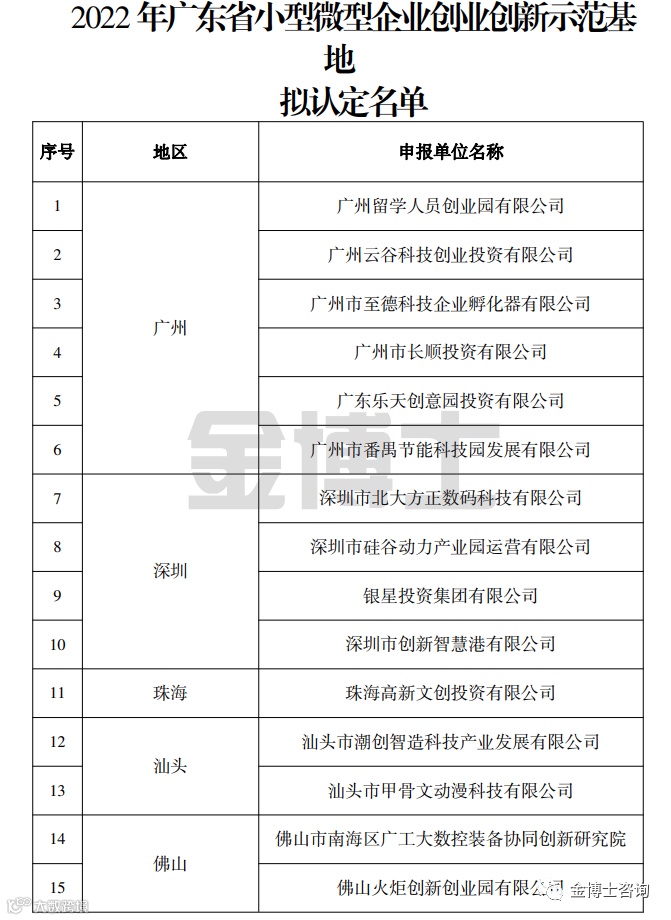 2. 2022年广东省小型微型企业创业创新示范基地拟认定名单