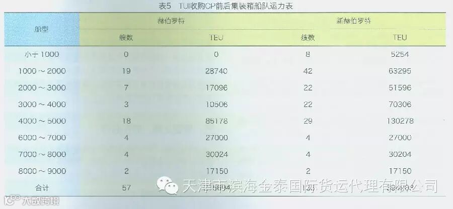 德国赫伯罗特航运的母公司德国旅游和航运集团(TUI)在2005年8月宣布收购CP,收购金额达到17亿欧元。该交易使得TUI的集装箱航运业务(赫伯罗特航运)一举跻身世界第5位[9J。从航线分布看,合并后的赫伯罗特亚欧航线仍保持原有服务水平,但大西洋航线和南美航线的规模和覆盖范围都得到了加强,太平洋航线和澳洲、|航线的覆盖范围也在互补基础上进一步拓展。TUI收购CP后集装箱船队状况如表5所示。