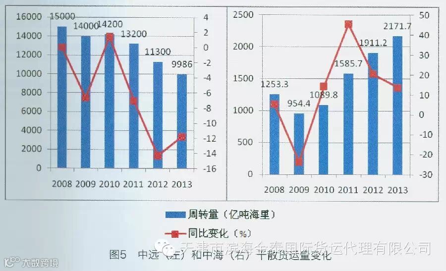 3。运力需求状况 中远和中海集团在干散货经营上存在明显差异(见图5)。近年来中远集团干散货年周转量几乎一直负增长,2013年末的干散货周转量跌至9986亿吨海里。根据目前市场的情况,中远集团干散货运输今年仍难有起色,其中既有国际干散货市场萧条的影响,也有中远船队结构不合理的因素。中海集团干散货运输规模相对较小,其周转量从2010年开始始终保持增长,2011年周转量同比增幅达45.5%。近两年增幅有所放缓,2013年增幅为13.6%,周转量达2171.7亿吨海里,创历史新高。如果未来市场没有大幅下行,中海集团干散货周转量还会进一步上升。