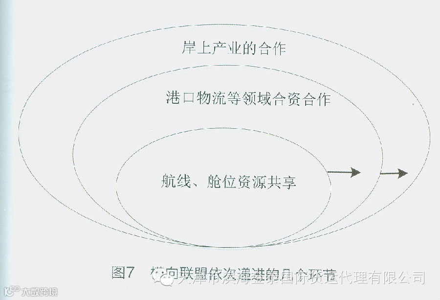 很明显,开展两集团的横向合作具有现实意义。从纵向角度,首先在市场范围内,进一步开展舱位共享、互租和航线联营,实现航线网络范围进一步扩大;其次,深化物流码头领域的交流,通过开展合资合作、互为供应服务商、共同享有客户等方式,实现两大集团利益的增长;最后,延伸业务范围至岸上,如开展船舶工业的联营,提高双方岸上整个运输供应链的服务水平和综合竞争力(如图7所示)。