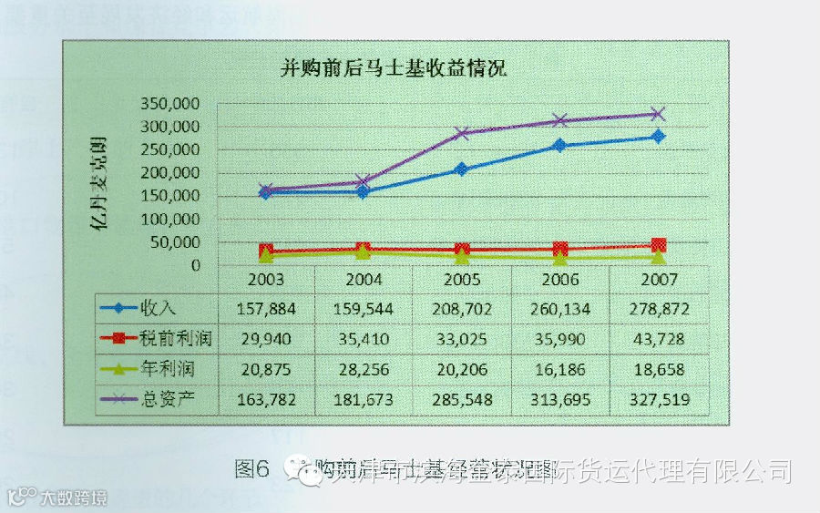 首先,马士基收购铁行渣华后,其船队运力高达550余艘、139万TED;占全球总运力由原来10%升至20%左右(见表4)。同时,以2004年业务量为基础进行匡算[8],合并后年箱运量达1600万TED左右,东西干航线市场份额明显增强,欧美干线的市场份额达到15%以上,南北航线和各主要航区内航线也可相互补充,在中国市场份额也进一步提升。其次,马士基利用铁行渣华的设施及其网络节省大量费用,降低了经营成本,提高了市场采购的议价能力。虽然2006年马士基年收益(约27.2亿美元)比2005年下降约20%,但2007年年利润达约34.3亿美元,比2006年回升26%(见图6);同时,并购前的2004年比2003年年收入增长1.05%,收购后的2007年则比2006年收入提高7.2%,可见马士基凭借并购一定程度上遏制了航运市场波动带来的利润下滑趋势。再次,经过不断并购业务,马士基已经成为集规模化和多元化经营为一体、海运和陆上物流于一身的全球海运霸主,具有更强的抵御风险能力。2012年,在大多数航运企业持续亏损的情形下,马士基仍取得年4.62亿美元的盈利,原因之一是广泛的经营业务和完善的产业链分担了航运业风险,一定程度上减缓了成本压力。