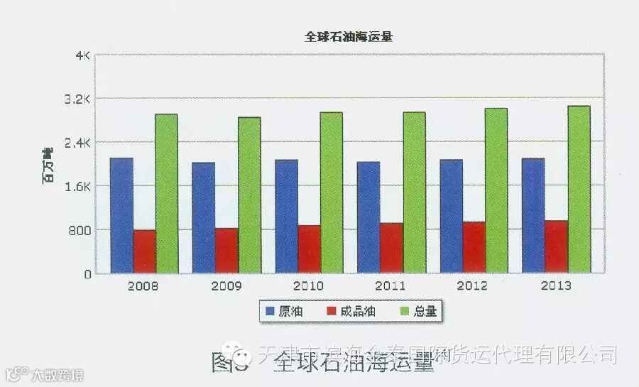 2008年金融危机对国际石油航运产生负面影响,国际油船运输市场震荡下行。货源需求方面全球原油贸易出现短时间的负增长,近两年来,在中国、印度等新兴市场驱动下,市场有所回暖。总体来看,近几年全球原油贸易稳中有升,全球石油海运量也将保持平稳。如图3所示。