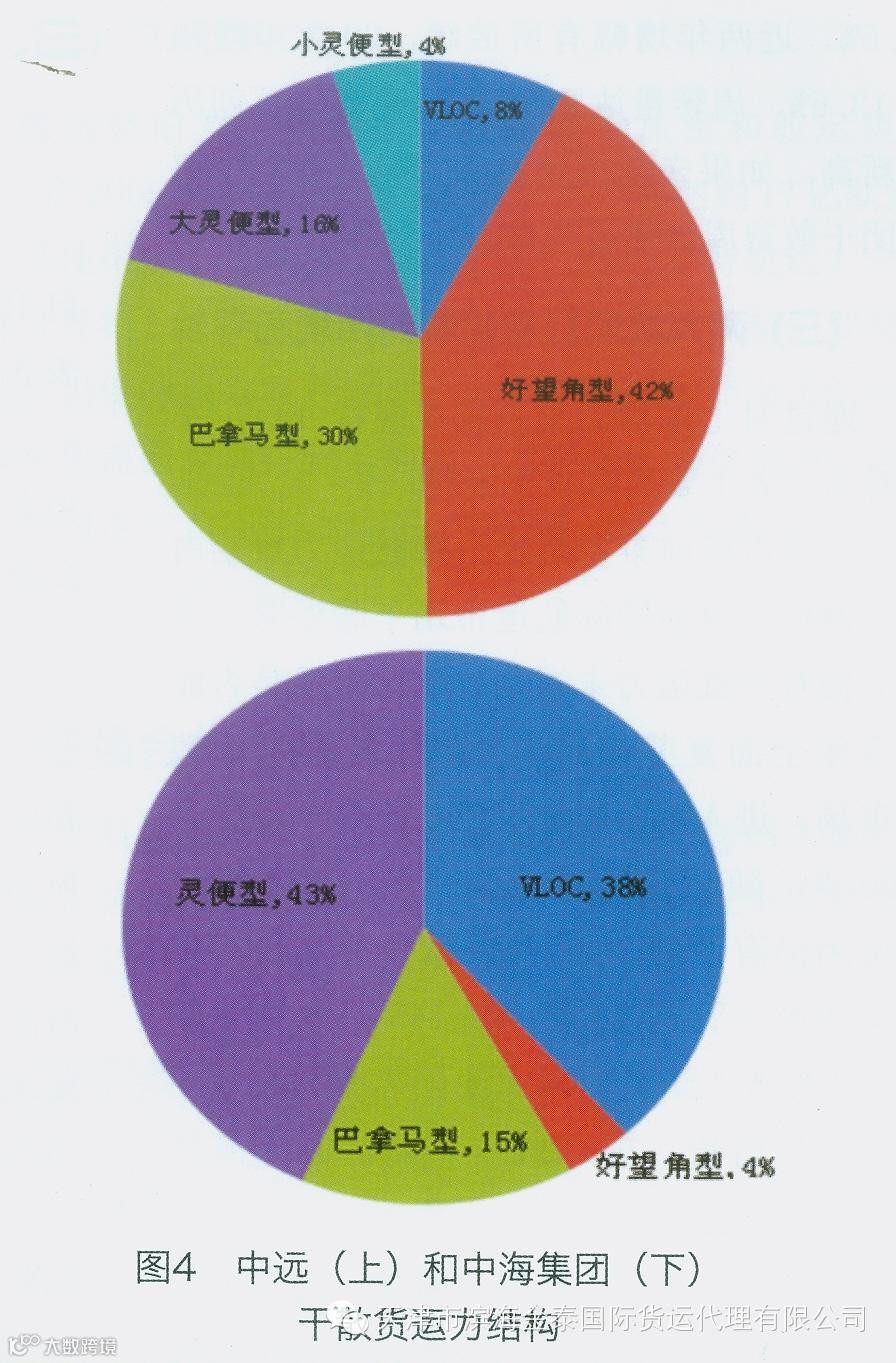 2。船队结构状况 中远干散货船队多为20万吨以下的船舶,好望角型船舶所占比重最大(见图4)。在当前市场环境下,好望角型与巴拿马、灵便型相比不具备运距优势,与VLOC相比不具备单位成本优势。从2011年年末开始,巴西淡水河谷的货主船队进入中国市场,如果大规模投放40万吨级矿石船,将会使18万吨级好望角船舶严重过剩和闲置,对中远无异于雪上加霜。中远集团近期订造的散货船均为 小吨位船舶,这意味着未来中远集团超大型散货船有所欠缺,发挥规模经济空间不足。而中海集团在船队发展计划中着重突出船舶的大型化和现代化,其干散货运力以VLOC和灵便型为主,好望角型只占4%(见图4)。虽然大规模的VLOC船队会对集团的揽货能力提出挑战,但在运价低迷的市场环境下VLOC可以维持较低的成本,并且在一定程度上抵御来自货主自有船队的挑战。