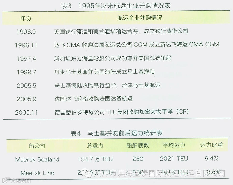 2005年,全球航运市场高速发展,航运企业迅速扩张。为保持集装箱航运业的领导地位,强化低成本竞争优势,世界排名第一的丹麦马士基航运与世界排名第三的铁行渣华达成并购协议,马士基支付23亿欧元(约30亿美元)收购铁行渣华一劳埃德,2006年底并购最终完成,马士基海陆公司CMaerskSealand)更名为马士基航运公司CMaerskLine)[7]。此次收购令全球航运界为之震撼,集装箱船队运力规模世界第一的马士基与排名第三的铁行渣华合并,诞生了世界集装箱班轮运输业“超级航母”。