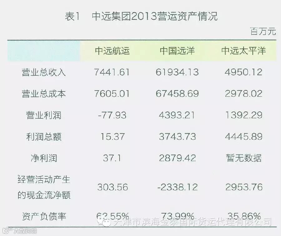 1。根据2013年中远集团的营运情况,A股上市的公司中国远洋和中远航运营业收入同比下降14.07%和3.23%。尽管如此,中国远洋仍实现了3年来首次赢利,中远航运也成功扭亏。然而,两家公司2013年营业总成本占营业总收入的比例分别为108.92%和102.20%,如此高昂的营业成本无法保证企业长期赢利。此外,高负债率也是中远集团近年来始终未能有效解决的问题,2013年两家公司负债率分别高达73.99%和62.55%,如表1所示。