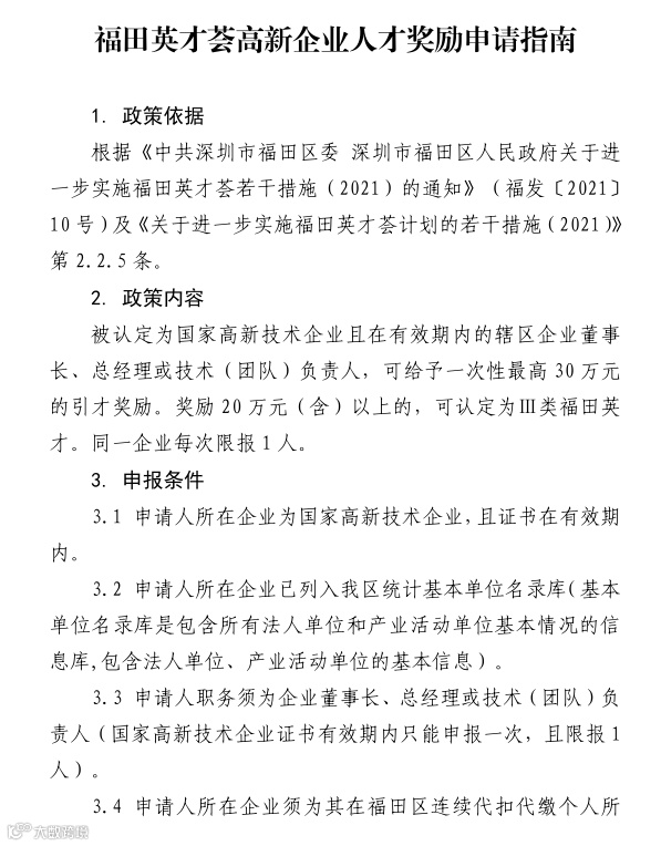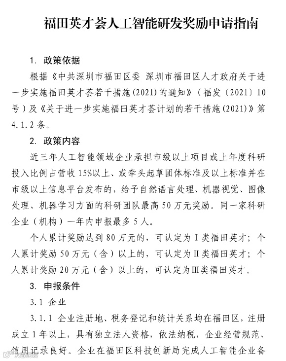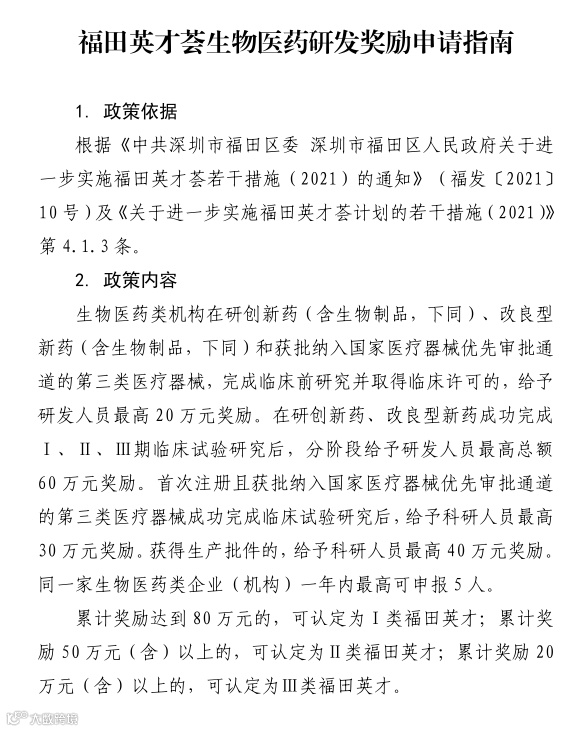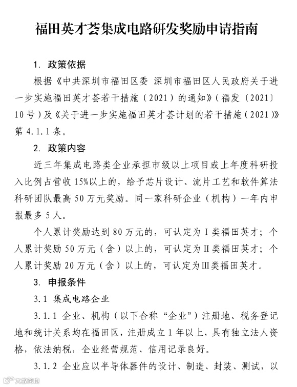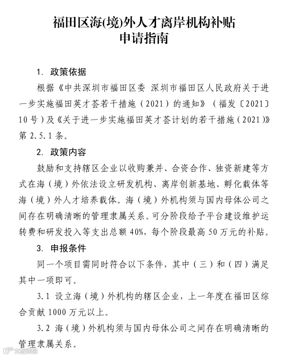 根据《关于进一步实施福田英才荟计划的若干措施(2021)》,福田区科技创新局负责落实福田英才荟“高新企业人才奖励”“集成电路研发奖励”“人工智能研发奖励”“生物医药研发奖励”“海(境)外人才离岸机构补贴”项目,以上项目申请指南已发布,并已在广东政务服务网开通(https://www.gdzwfw.gov.cn/portal/branch-hall?orgCode=007542769),网上填报受理时间于2022年9月30日截止。请各有关单位按照指南要求积极申报。