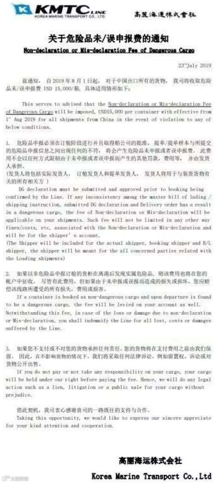 兹通知,自2019年8月1日起,对于中国出口所有的货物, 我司将收取危险品未/误申报费USD 15000/箱, 具体适用情形如下: