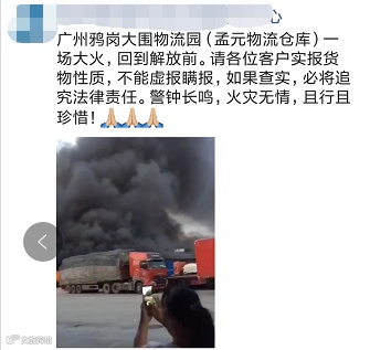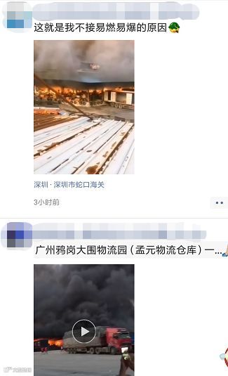 在物流园上班的黄先生告诉南方+记者,凌晨5时左右,鸦岗大围物流园里的孟源仓库已经起火。随后,火势变大,火光冲天,浓烟滚滚,还不时发出爆炸的声音。家住附近的林先生表示,物流园内过火面积很大,整个仓库,包括部分集卡连同集装箱还有货物被烧毁,周边的一些物流集装箱货车也被点燃了。
