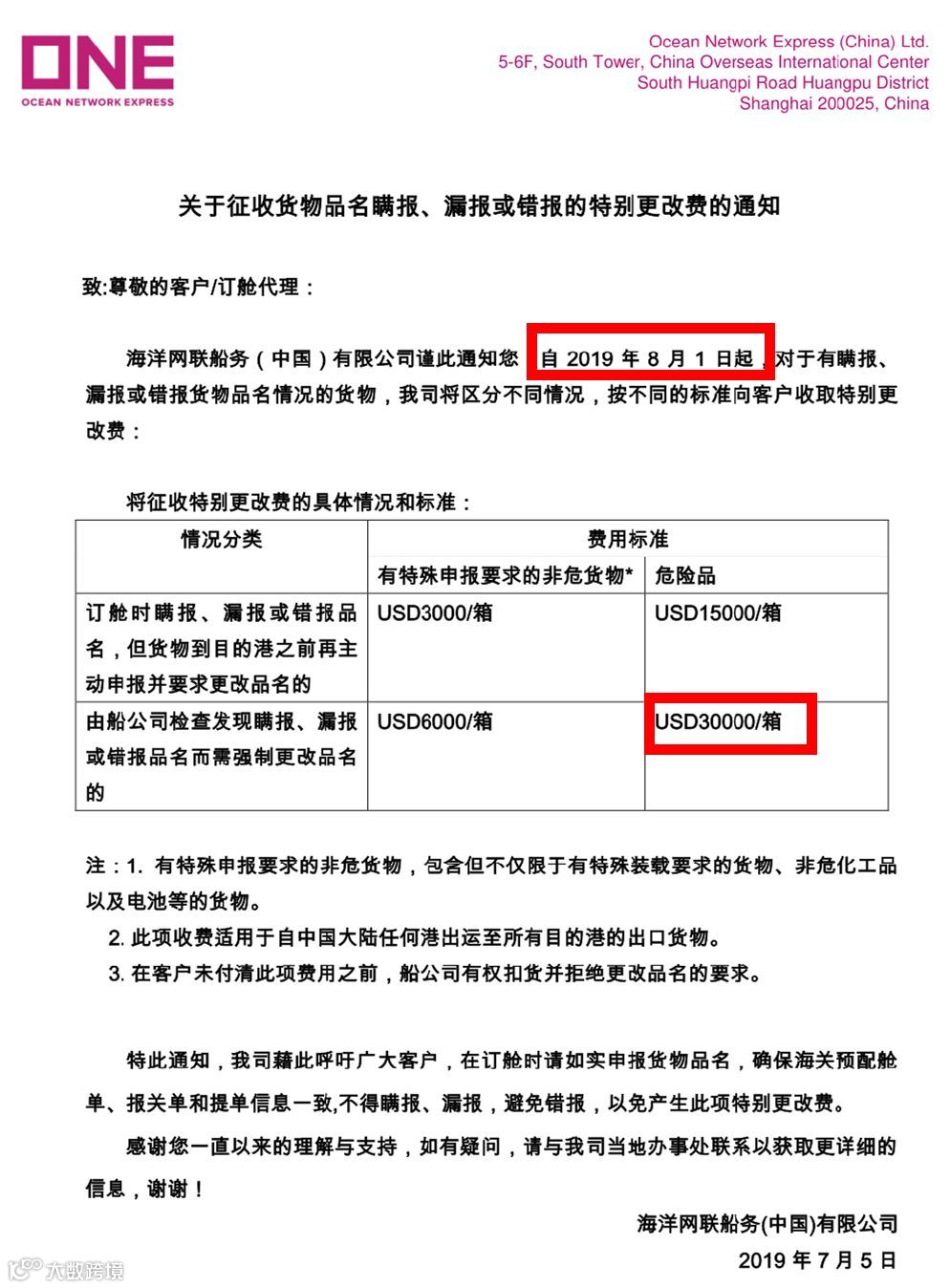 海洋网联船务(中国)有限公司谨此通知您,自2019年8月1日起,对于有瞒报、漏报或错报货物品名情况的货物,我司将区分不同情况,按不同的标准向客户收取特别更改费: