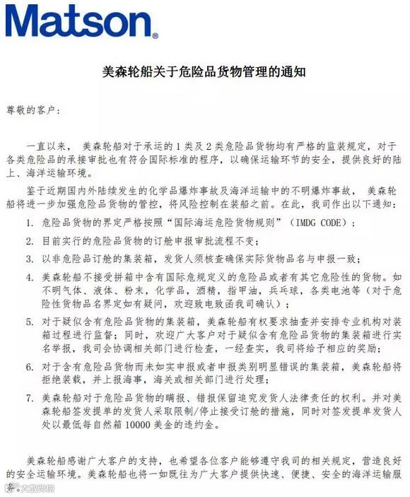 鉴于近期国内外陆续发生的化学品爆炸事故及海洋运输中的不明爆炸事故, 美森轮船将进一步加强危险品货物的管控,将风险控制在装船之前。在此,我司作出以下通知: