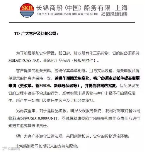 近期各地连续发生多起危险品瞒报事件,瞒报严重危害了船舶、人员安全及守法客户的货物安全为维护正常的营商秩序,自201年8月1日(运费起算日)起,大中华地区出口至全球的货物如发生危险货物错报、瞒报及漏报相关客户须支付违约金15000USD/每自然箱,同时我司将就因错报、瞒报、漏报导致的全部损失和费用向责任方进行索赔。