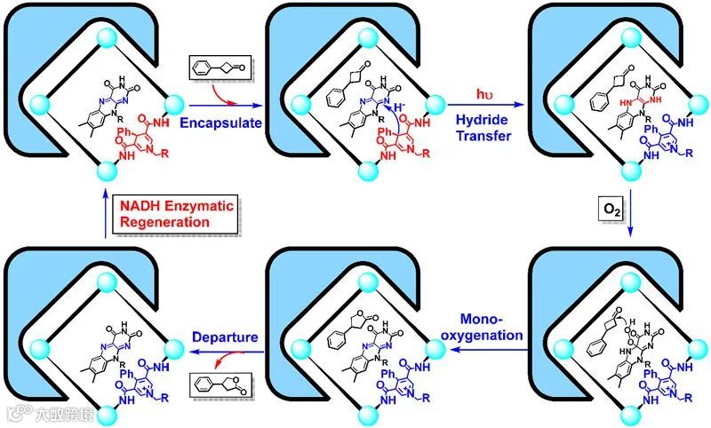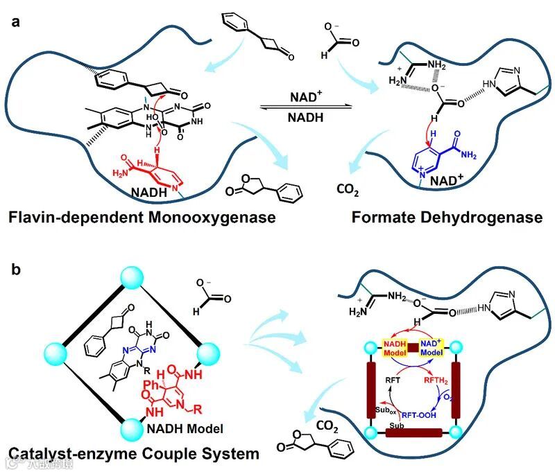 天然酶促级联反应体系仅需催化计量的辅酶便可在复杂的体系内完成高效、高选择性多步串联催化过程,是设计理想人工催化体系的最佳模型。尤其在提倡绿色发展精细化工产业的当前,仿生催化不仅能够减少精细化学品催化生产工业中大量高反应活性、高毒性氧化剂或还原剂的投入,还可以解决污染严重和反应条件苛刻等问题。辅酶在多步串联反应间的直接高效利用和动力学匹配是提升串联反应体系效率的重中之重。学习和领悟自然界酶促过程,组装金属-有机限域超分子体系,通过主客体作用协同天然酶催化是完成辅酶原位循环利用、实现持续循环串联反应的重要手段。近日,大连理工大学精细化工国家重点实验室段春迎教授团队基于前期工作基础(J. Am. Chem. Soc., 2019, 141, 12707−12716; Chem. Commun., 2019, 55, 8524−8527; Angew. Chem. Int. Ed., 2017, 56, 8692−8696; Angew. Chem. Int. Ed., 2017, 56, 15284−15288),在限域超分子拟酶催化领域取得突破性进展,提出利用辅酶基金属-有机限域超分子结构与天然酶催化体系相耦合的“套娃”式催化新策略,可直接应用于仿生催化单加氧反应。