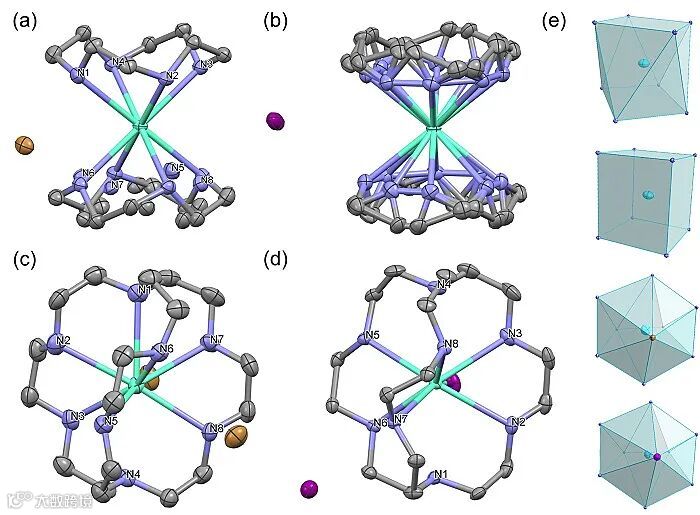 图1. 四种大环Eu2+配合物的晶体结构和配位多面体结构。