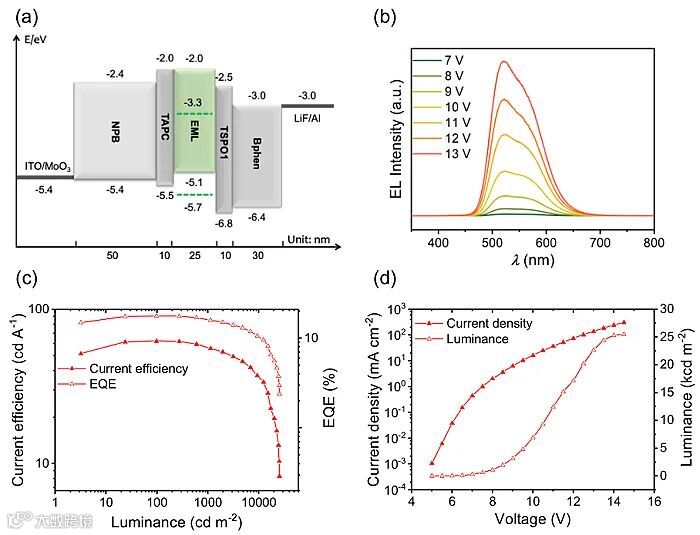 图2. 基于Eu2+配合物的OLED器件结构示意图和性能曲线。