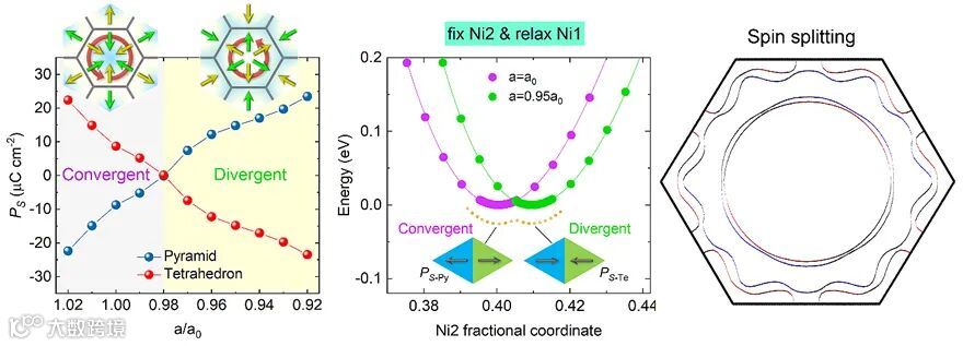 第一性原理计算的结果显示,伴随可调双线性双势井的出现,面内压应力的施加导致多面体的拓扑极性由同心收缩转变为同心发散构型,两者卷绕数均为一。镍阳离子的双重作用,即多面体内的极性位移和Ni-Ni金属键的三维键合,是拓扑铁电性与金属性共存的根本原因。与此同时,可翻转的多面体极性与自旋轨道耦合诱导的动量依赖的自旋劈裂同样存在耦合关联。