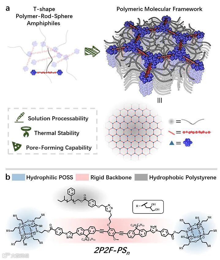 最近,华南理工大学华南软物质科学与技术高等研究院、美国Akron大学的程正迪(Stephen Z. D. Cheng)院士团队设计了一类具有聚合物-棒-球结构的T-型两亲分子(图1b),并通过简单的溶液挥发-热退火工艺成功制备了一类新型的聚合物分子框架材料(Polymeric Molecular Frameworks,图1a)。这类框架材料具有良好的机械性能、热稳定性与多样化的可加工性。