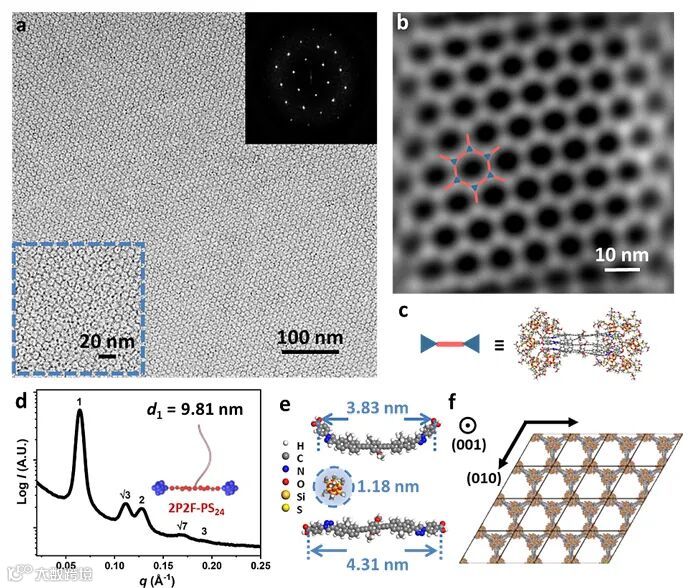 研究人员利用不同的表征手段,系统性地阐明了聚合物分子框架结构形成的机理(图2)。小角X射线散射和透射电镜表征展示了高度有序的纳米尺度微观结构。结合高角环形暗场扫描透射电子显微镜(HAADF-STEM)表征以及电子密度分布和散射强度的模拟结果,研究人员提出了分子堆积模型:基于寡聚芴的棒状基元(红色部分,图1a)是框架结构“臂”的主要组成部分,为框架结构提供了力学支撑;亲水POSS球的聚集体(蓝色部分,图1a)组成框架结构的节点,将框架结构有序的连接起来;疏水聚苯乙烯链(灰色部分,图1a)可以填充框架结构中的空隙,为框架结构的形成提供热力学稳定的基础。