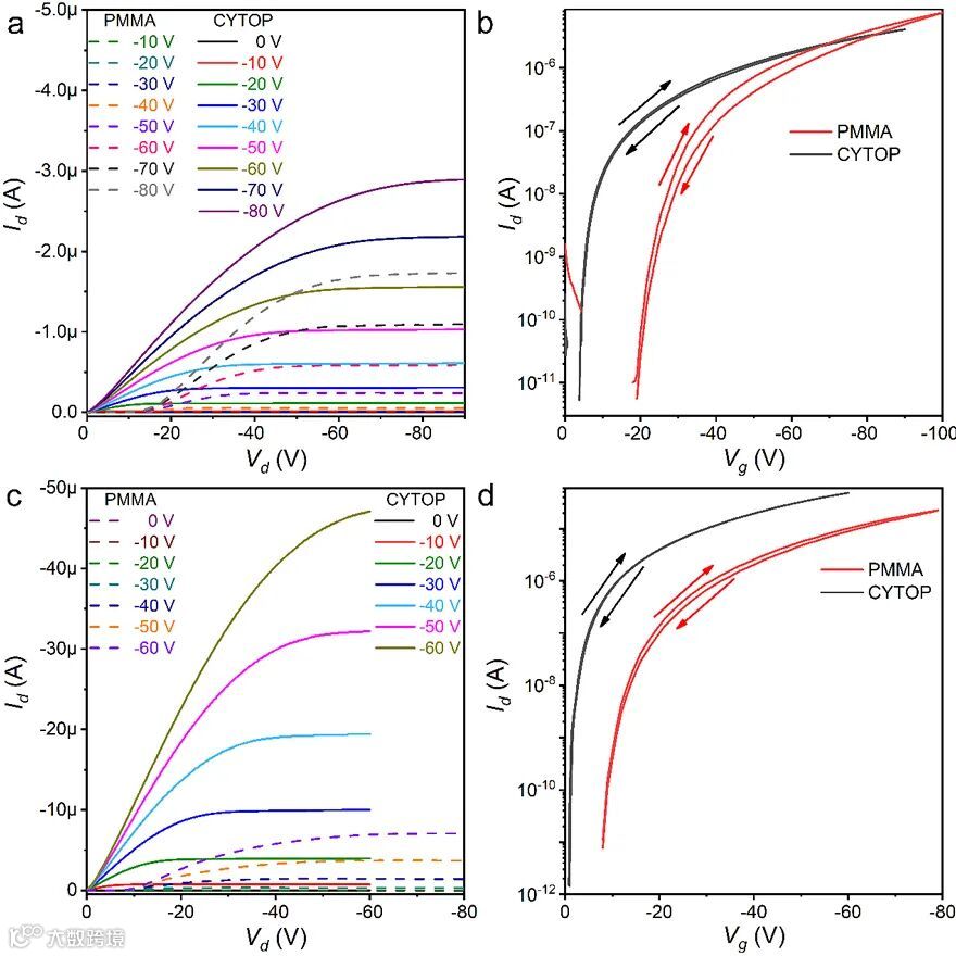 图2. 基于α-PBTA晶体在聚甲基丙烯酸甲酯(PMMA)和全氟带有机塑料(CYTOP)界面上的(a)输出曲线对比和(b)转移曲线对比图。基于β-DBPA晶体在 PMMA和CYTOP界面上的(c)输出曲线对比和(d)转移曲线对比图。