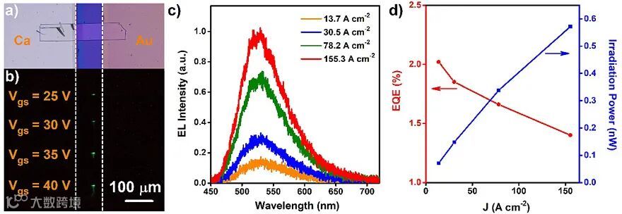 图3. 基于β-NBTA的场效应发光晶体管。a) 场效应发光晶体管在自然光下的照片。b) 场效应发光晶体管在不同栅电压下的发光照片。此时背景光源完全关闭,观察角度仍然为正上方。c) 场效应发光晶体管在不同的电流密度下工作时的器件发光光谱。d) 场效应发光晶体管外量子效率(EQE)和辐射功率随工作电流密度变化曲线。器件的最大外量子效率达到2.02%。