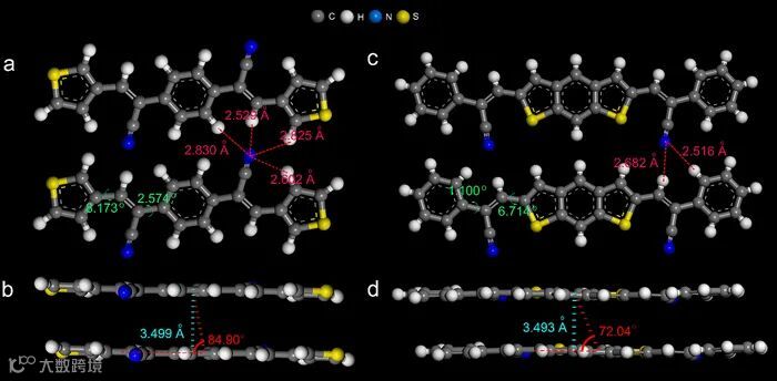 图1. a) (2Z,2'Z)-2,2'-(1,4-phenylene)bis(3-(thiophen-3-yl)acrylonitrile) (α-PBTA)和b) (2Z,2'Z)-3,3'-(benzo[1,2-b:5,4-b']dithiophene-2,6-diyl)bis(2-(thiophen-3-yl)acrylonitrile) (β-DBPA) 二维单晶晶体结构。