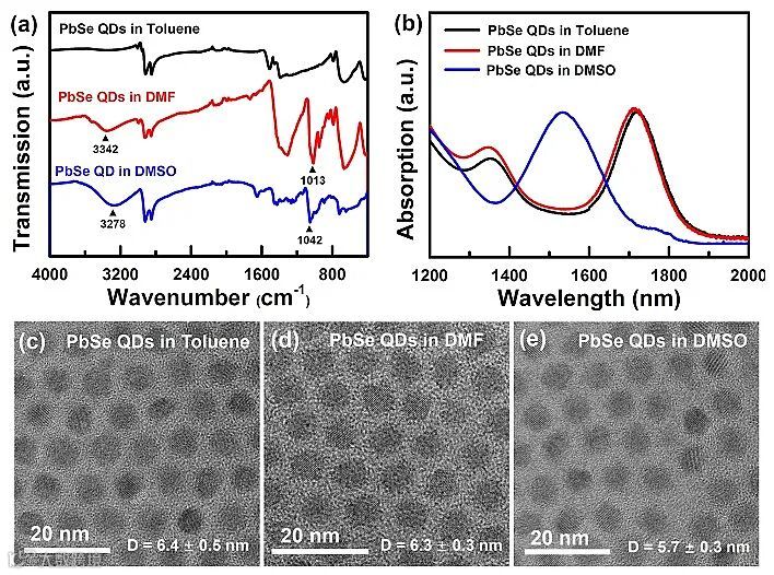 图2. 配体交换前后PbSe量子点的红外光谱(a)、吸收光谱(b)和TEM照片(c-e)。