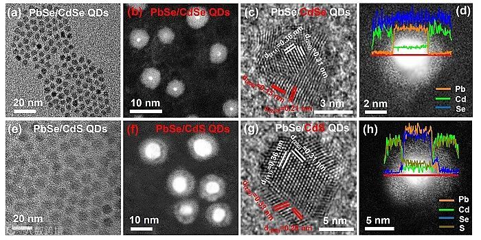 图3. PbSe/CdSe和PbSe/CdS核壳量子点的TEM照片(a和e)、STEM照片(b和f)、HRTEM照片(c和g)和线扫STEM-EDS分析图(d和h)。