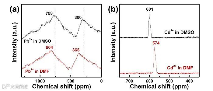 图5. Pb2+和 Cd2+ 分别在 DMF和DMSO中的207Pb (a) 和113Cd (b)核磁光谱。