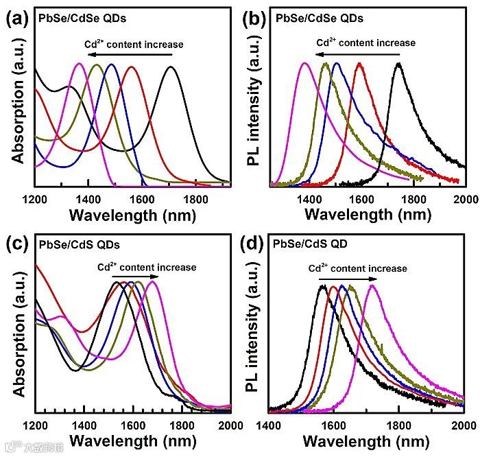 图4. PbSe/CdSe和PbSe/CdSe核壳量子点的吸收光谱(a和c)和荧光光谱图(b和d)。