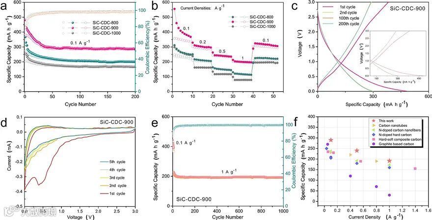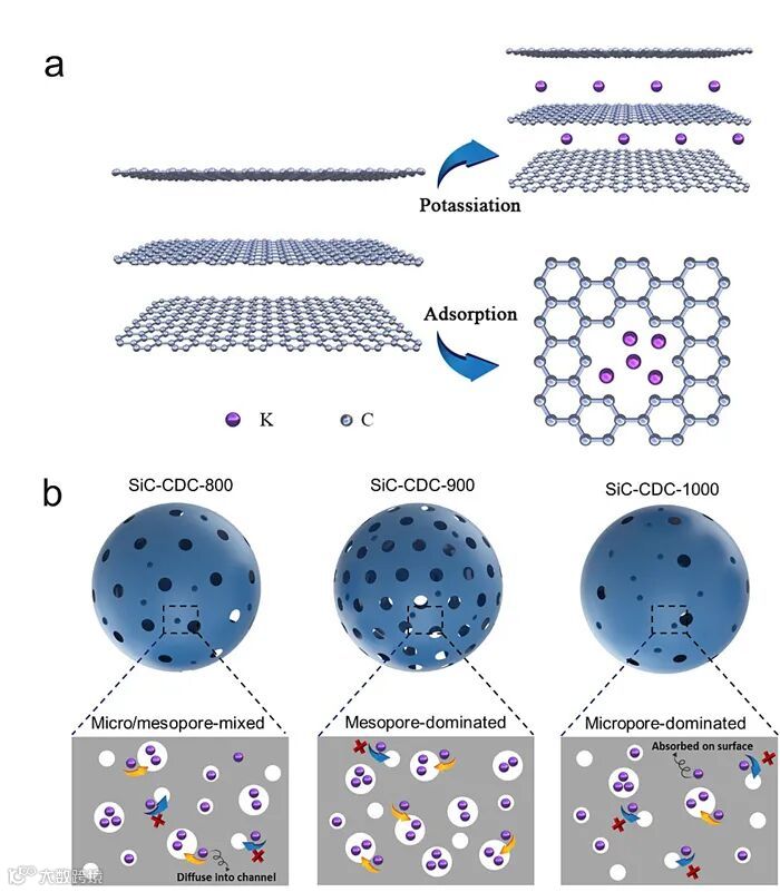 近日,武汉科技大学李轩科教授课题组在国际顶级期刊Advance Functional Materials (影响因子:16.836) 上发表研究论文,通过控制刻蚀温度合成了具有可控孔结构的碳化硅衍生碳材料(SiC-CDC)。其中900摄氏度处理下的碳化硅衍生碳负极材料(SiC-CDC-900),其具有高介孔孔容的发达孔结构及合适的比表面积,不仅提高了钾离子的有效吸附,显著缩短了电解液的渗透路径,还为钾离子的吸附提供了丰富的活性位点,从而促进了电容储钾动力学的进行。在电流密度为0.1 A g-1的条件下循环200圈后,SiC-CDC-900电极的可逆比容量高达284.8 mA h g-1;在电流密度为1 A g-1条件下循环1000圈后,它的可逆比容量为197.3 mA h g-1。这项工作为开发电容储钾的负极孔结构的设计提供了理论参考,并揭示了碳化物衍生碳基材料作为高性能钾离子电池负极的应用前景。
