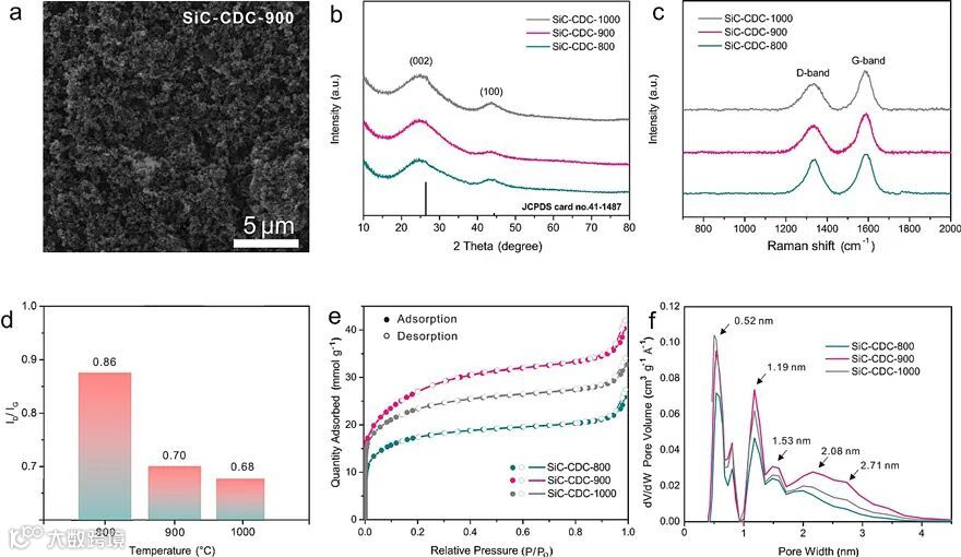图1. 碳化硅衍生碳的SEM、XRD、Raman、BET表征。