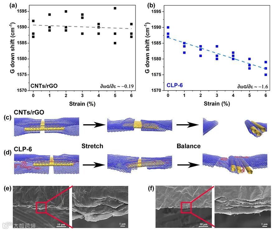 图3. 交联前后复合纸在应力作用下的原位拉曼光谱(a, b)与分子动力学示意图(c, d)。