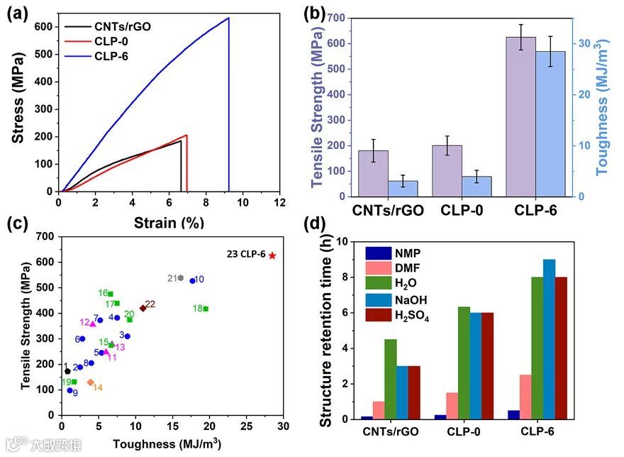 图2. 不同复合纸的力学性能:(a)应力-应变曲线,(b)拉伸强度与韧性柱状图,(c)CLP-6(红色,五角星形)的拉伸强度和韧性与其他类似材料在复合纸平面方向的拉伸强度和韧性的比较:rGO(黑色,五边形),氢键交联(蓝色,圆形),金属离子交联(玫瑰红,三角形),共价键交联(橙色,菱形),π-π作用交联(灰色,六边形)和多重相互作用的交联(绿色,矩形),(d)复合纸在超声作用下,在不同溶剂中的稳定时间。