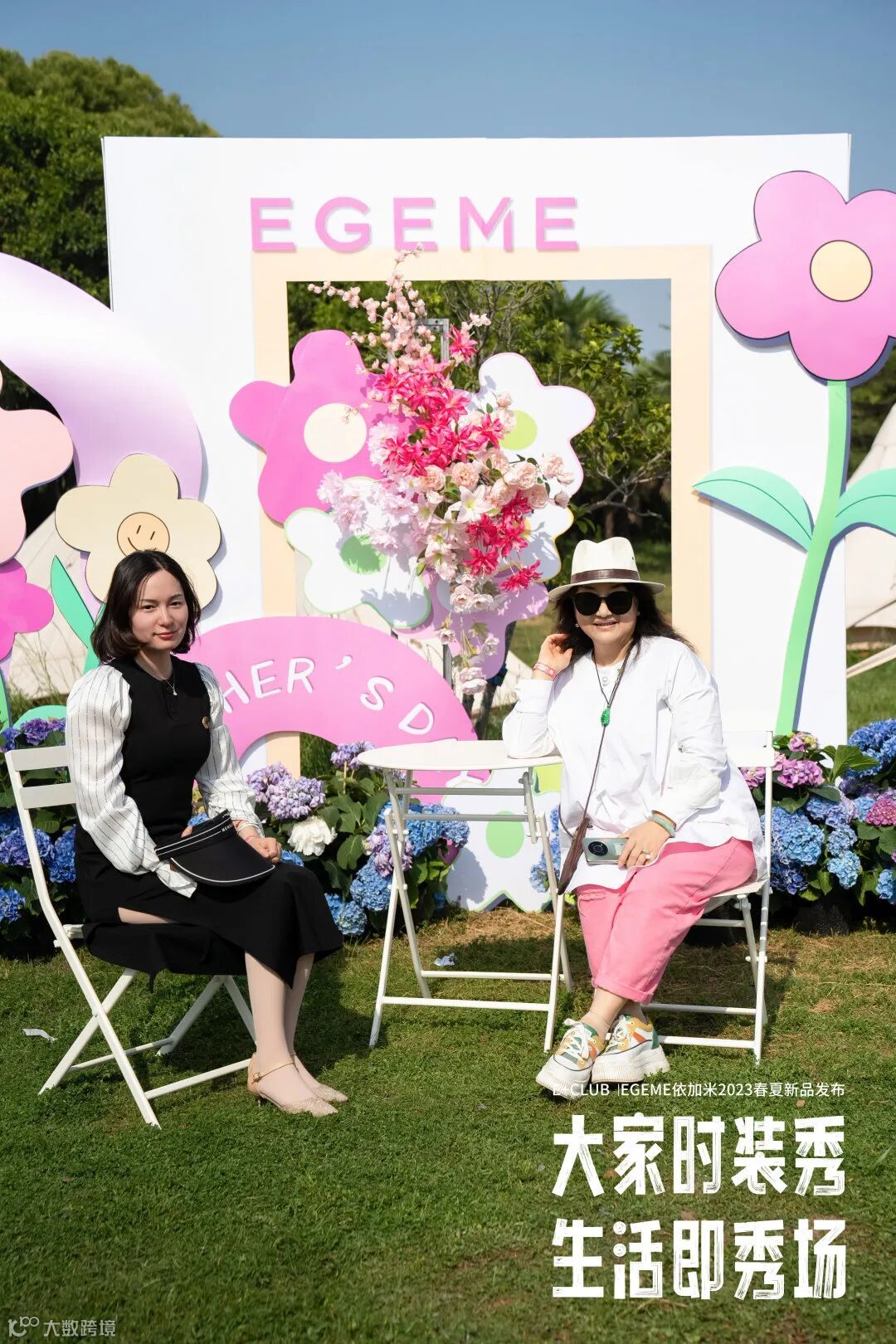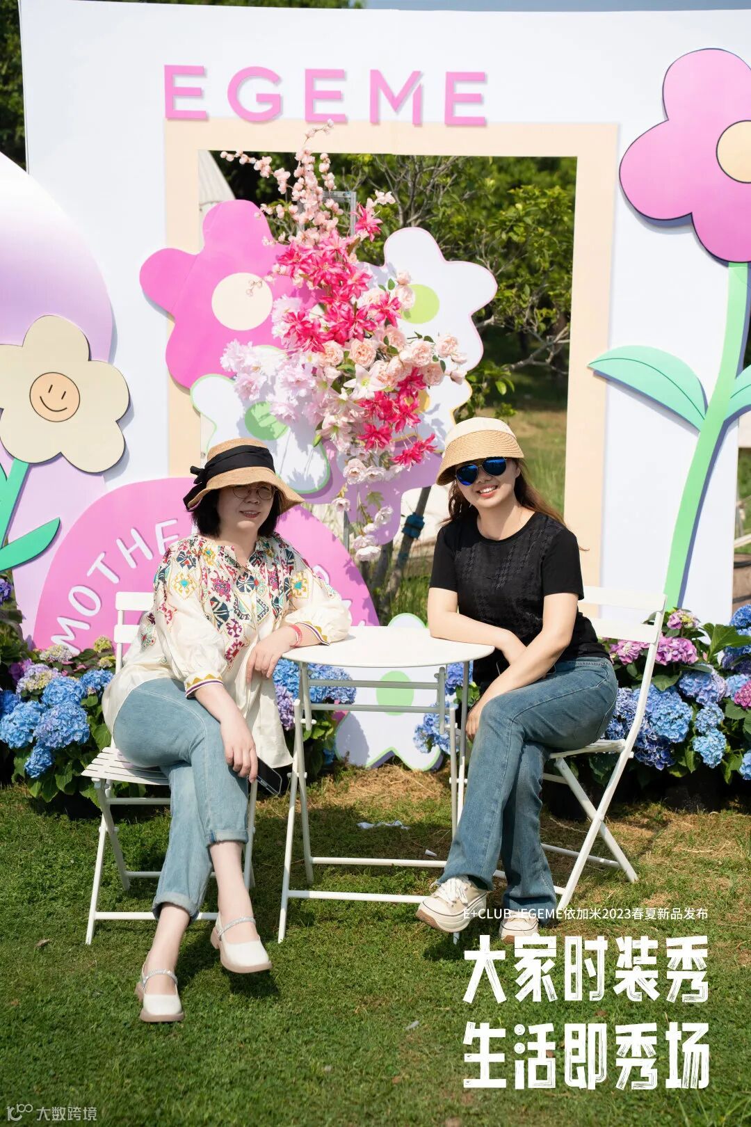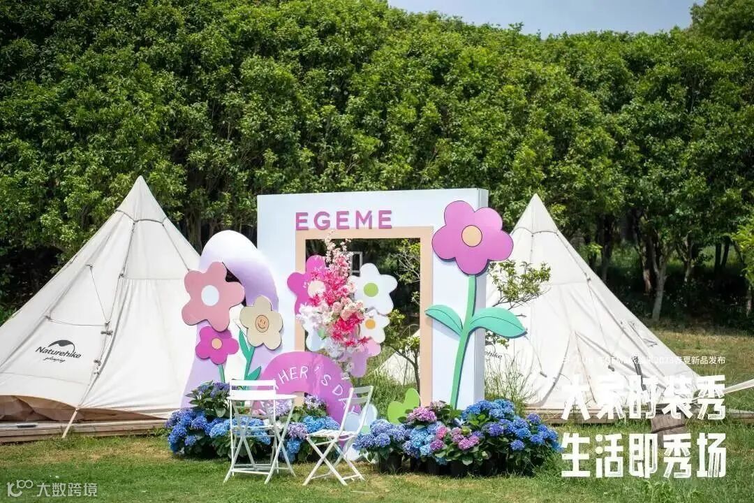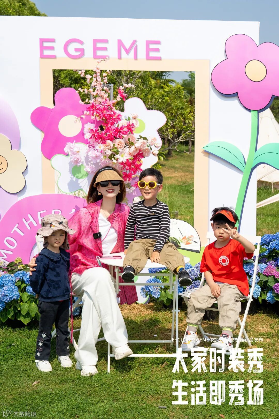依加米2023春夏新品户外大秀和母亲节遇见,现场为大家准备了母亲节打卡区,邀请朋友们来一张户外全家福,晒图赢取消费券,迎来了很多家庭的打卡,背景墙主题也围绕了年度流行趋势色彩开展 ,围绕一圈绣球花在大自然中记录这美好温情的节日。