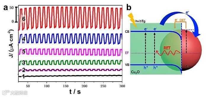得益于结构单元物理分离带来的电荷分离效率提升,Au-Cu2O Janus结构的光催化性能得到了显著提高:相比Au-Cu2O核-壳结构以及纯Cu2O晶体,Janus结构的光电流分别提高了5和10倍。对比分析各结构的瞬态荧光寿命,进一步验证了Janus结构高效的电荷分离效率。同时,通过球差电镜电子全息分析首次直观展现了Au-Cu2O界面形成的肖特基势垒。上述界面能控制策略,突破传统方法在金属-半导体杂化材料结构合成上的限制,不仅实现了Au-Cu2O杂化结构在光催化性能上的显著提升,也为金属-半导体杂化材料的合成控制与进一步的应用开启了一扇新的大门。