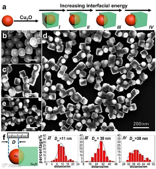 近日,南京工业大学冯宇华教授和陈虹宇教授课题组,基于界面能调控策略,通过巯基小分子强配体调节Au与单晶Cu2O材料之间的界面能,实现了Au-Cu2O从核壳结构到Janus结构的突破。更重要的是,通过单一改变配体用量对Au种子表面能的连续调控,得到了一系列连续变化的Janus结构,表现出传统方法无法实现的调控力,与传统的杂化结构合成中主要取决于材料的本性形成鲜明对比。