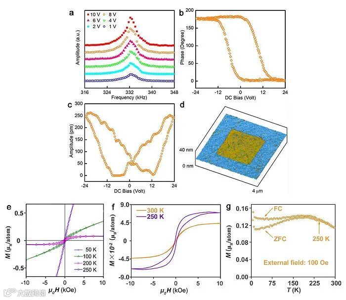 图2. Ni(DPA)2铁电和铁磁表征。a,压电力显微镜(PFM)下,近室温不同垂直外加电压下的共振频率依赖的垂直振幅响应;b,垂直PFM的相位-电压滞后回线;c,振幅-电压蝴蝶回线;d,Ni(DPA)2微米晶的电畴反转图像;e和f,不同温度下的磁滞回线;g,场冷和零场冷磁温曲线。