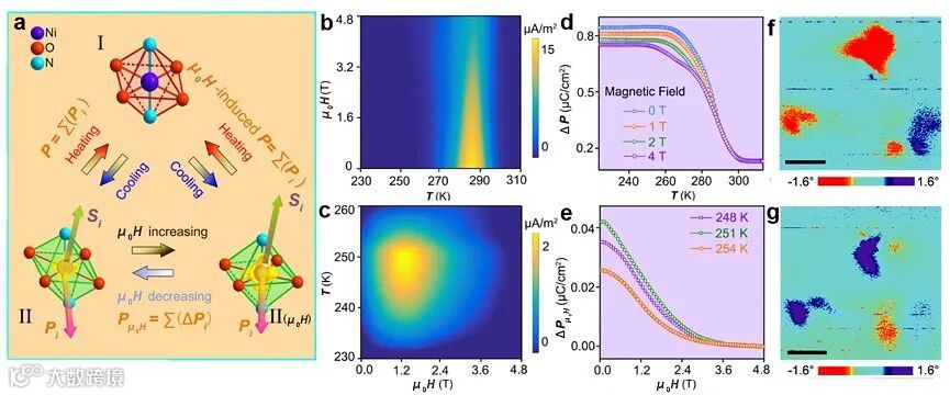 图4. 磁电耦合原理图及表征。a,磁电耦合相变模型;b,不同温度下,磁释电电流随磁场的变化;c,不同的磁场下,热释电流随温度的变化;d,不同磁场下,总电极化随温度的变化;e,不同温度下,磁电极化随磁场的变化;f,近室温磁畴图像;g,加5v垂直偏压下的磁畴图像。