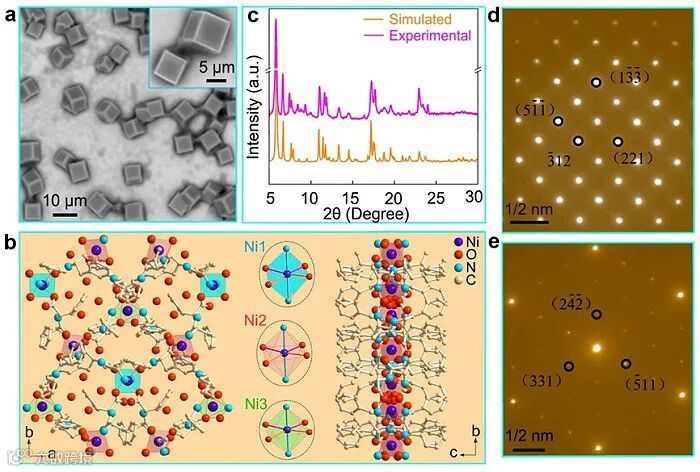 图1. Ni(DPA)2结构表征。a,Ni(DPA)2晶体的扫描电子显微镜(SEM)照片;b,单晶X射线衍射(XRD)表征结构,层状结构的每一层由三种以Ni离子为中心的扭曲的{NiN2O4}八面体组成;c,实验和模拟的粉末XRD;d和e,选区电子衍射(SAED)图。