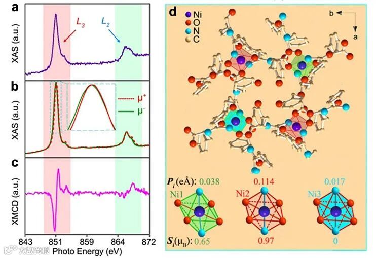 图3. 室温Ni(DPA)2的K-边缘-X射线吸收光谱(K-edge XAS)表征和优化的层内单胞结构。a,室温Ni L2,3 XAS谱;b,用圆偏振光在600 Oe垂直磁场下得到的室温Ni L2,3 XAS谱;c,室温Ni L2,3-edge的X射线磁圆二色谱(XMCD);d,优化的室温层内单胞结构。