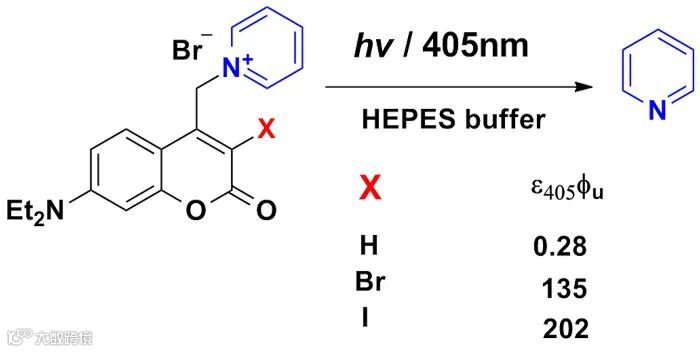 中科院化学研究所分子纳米结构与纳米技术院重点实验室方晓红研究员课题组近期发展了通过抑制分子内电子转移在水溶液中光解N-烷基吡啶盐释放吡啶的新策略。以7-二乙胺基-4-甲基香豆素保护的吡啶为研究对象,利用溶剂效应和TD-DFT理论计算发现,因存在香豆素与吡啶盐的快速分子内光致电子转移(Photoinduced Electron Transfer, PET),导致脱去吡啶保护基团的光解反应难以进行。利用香豆素单线态S1与三线态T1间的能量差,在保护基团香豆素的3位引入重原子溴或者碘,提高S1态隙间穿越至T1态的几率,可抑制分子内电子转移,使得光解相应N-烷基吡啶盐的效率分别提高约400或700倍。