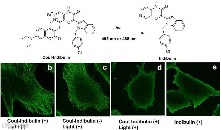 该光解反应策略具有较好的普适性,适用于大多数吡啶衍生物以及咪唑和噻唑,化学产率高,成功用于二十余种吡啶化合物的光控释放,光解效率与吡啶环上氮原子的亲核能力和吡啶环的电子云密度相关。值得指出的是该光解反应亦可通过双光子激发来实现,以N-烷基吡啶盐为例,其在880 nm光照下的双光子光解吸收截面高达0.51 GM。最后,该光解反应可用于活细胞内的活性分子释放。在光毒性较低的488 nm光照下,实现了含有吡啶结构的微管蛋白聚合抑制剂Indibulin在活细胞内的释放和对微管蛋白聚合抑制功能的调控。