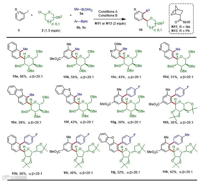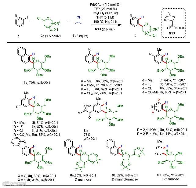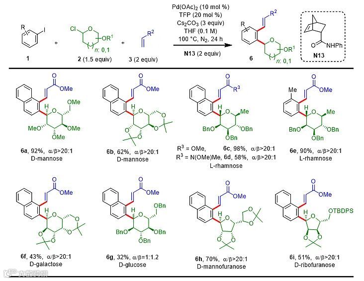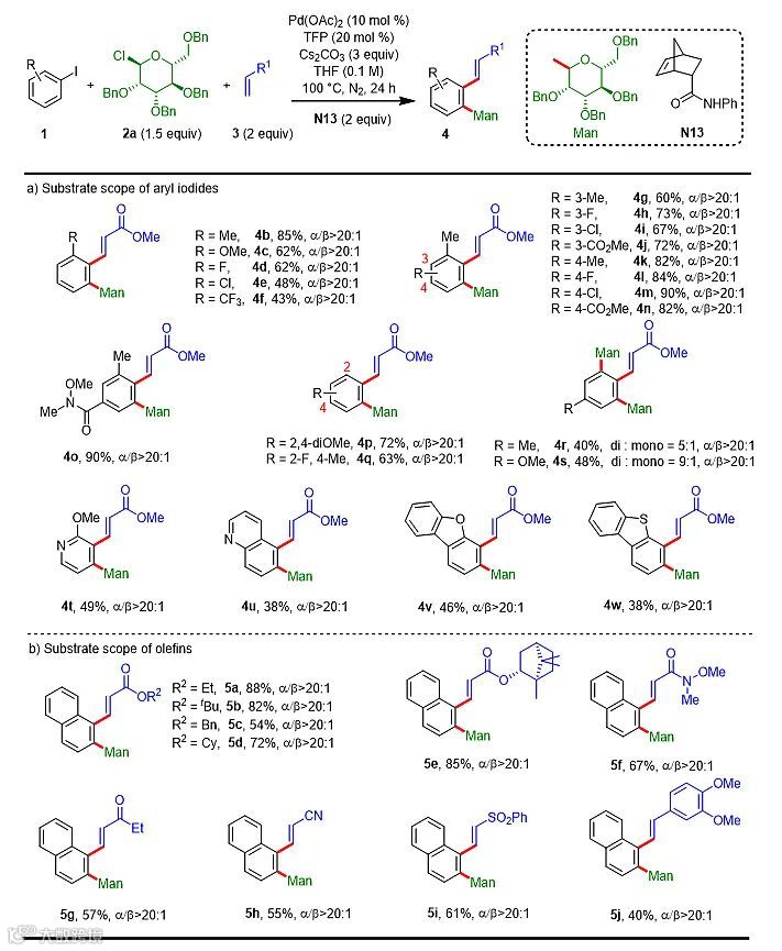 作者以1-碘萘(1a)、四苄基保护的α-甘露糖基氯(2a)和丙烯酸甲酯(3a)为模板底物对反应条件进行了优化,并系统地评估了各种降冰片烯(NBE)对该转化反应性的影响(图2)。研究表明,发现酰胺取代的NBE(N11)和(N13)可以提供最佳结果。值得注意的是,NBE对于该反应至关重要,在缺乏NBE的情况下未观察到任何产物。