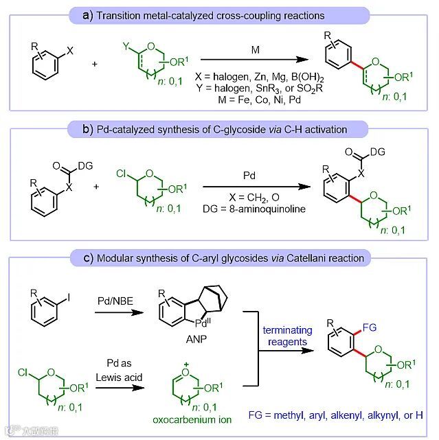 C-糖苷与O-糖苷相比具有较高的化学和代谢稳定性,因此已被广泛用作碳水化合物模拟物。它们是许多天然产物和药物中必不可少的结构部分。合成这些化合物传统上主要依赖过渡金属催化的偶联反应(图1a)。2019年Chen报道了Pd催化的8-氨基喹啉导向的邻C-H糖基化反应(Nat. Catal., 2019, 2, 793, 图1b)。可见,开发非导向的C-H糖基化,特别是以模块化和立体选择性的方式进行,将具有重要的理论和应用价值。