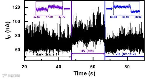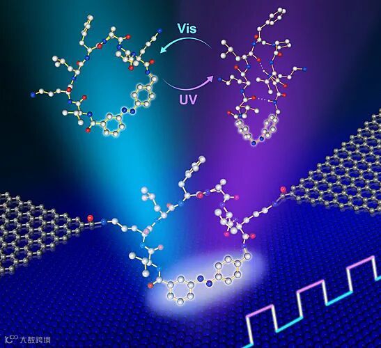 该环肽分子包含一个偶氮苯光响应基团和两个含氨基的侧链,利用两侧的氨基,与羧基化的石墨烯电极形成的稳定酰胺键共价连接,构建了单分子多肽纳米器件。在紫外光照条件下,环肽分子呈现顺式β 折叠的立体结构,并形成了分子内氢键;而处于可见光照时,分子内氢键断裂,环肽分子形成反式无序二级结构。通过单分子电学检测和多尺度计算模拟,他们研究了环肽分子的光响应与电导值之间的变化规律。
