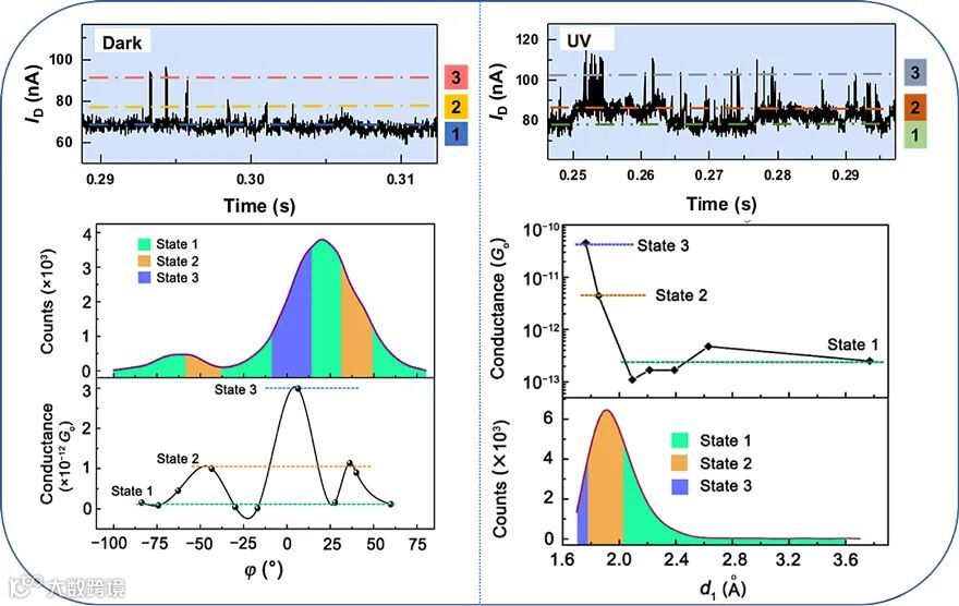 图3. 不同光照条件下分子电导实验与理论计算结果 左上:暗态实验结果 左下:暗态理论计算结果;右上:紫外态实验结果 右下:紫外态理论计算结果