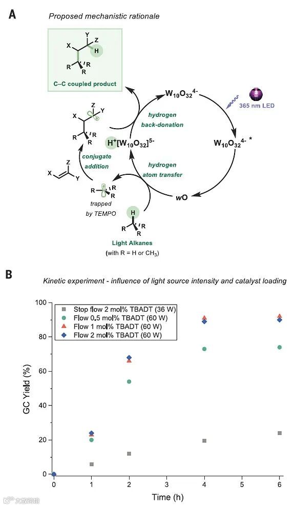 在之前类似工作的基础上,作者提出了一个可能的反应机理:在365 nm紫外光照射下,钨酸阴离子被激发;激发态的钨酸阴离子可以从气态低碳烷烃中攫取一个氢原子生成碳自由基,从而实现底物的碳氢键活化,而钨酸阴离子催化剂则变为含有一个氢原子的钨酸阴离子(H+[W10O32]5-);随后,该碳自由基被自由基捕捉剂捕获生成新的碳碳键,后者从H+[W10O32]5-中得到一个氢原子转化为最终产物,同时钨酸阴离子也实现了催化循环(图4A)。另外,作者发现反应光源的光强对该反应的影响非常大。在32 W UV-A发光二极管光源下,丙烷的反应非常缓慢。当用60 W UV-A 发光二极管光源时,反应效率则大大提高。对于甲烷的活化,反应则需要用150 W的强光(图4B)。