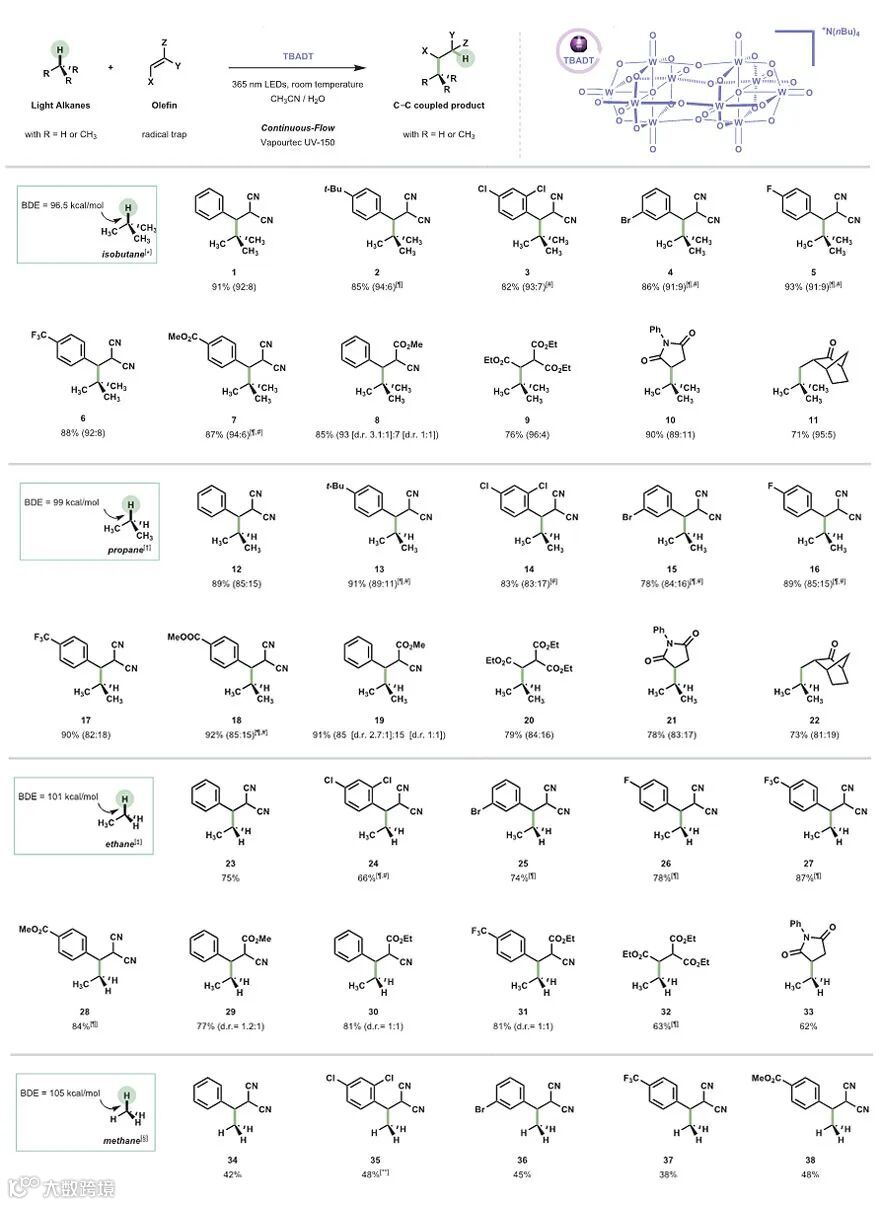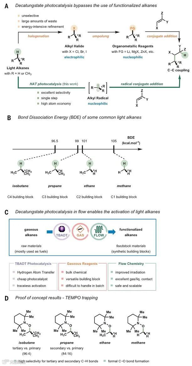 和多步工艺相比,通过碳氢键选择性活化直接实现碳氢键的官能团化更符合绿色化学的理念。虽然已有若干直接碳氢键活化低碳烷烃的例子,但是这些反应往往底物范围窄、选择性低或者实际应用价值有限。在这个背景下,近期荷兰埃因霍芬理工大学(TU/e)的Timothy Noël教授等研究者发展了一个通用且温和的策略,无需预官能团化,在流动反应条件和室温下使用廉价的十钨酸四丁基铵(tetrabutylammonium decatungstate, TBADT)为光催化剂,通过氢原子转移(HAT)来活化低碳烷烃(甲烷、乙烷、丙烷和异丁烷)的C(sp3)–H键,所得碳中心自由基可被多种迈克尔受体高效捕获,从而以良好的分离收率和高选择性产生相应的加氢烷基化加合物。该工作发表在Science 上,共同第一作者为Noël教授课题组研究生Gabriele Laudadio和上海科技大学与中科院上海高等研究院孙予罕教授课题组联合培养研究生邓宇超(Yuchao Deng)。