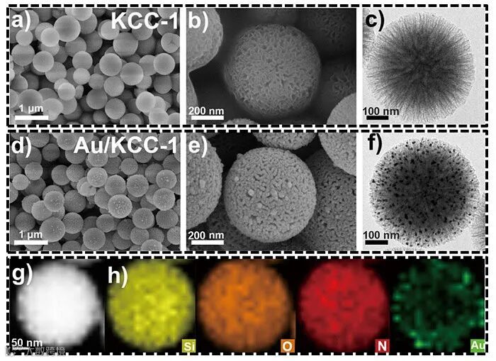 图2. Au/KCC-1材料的形貌表征和元素分析图